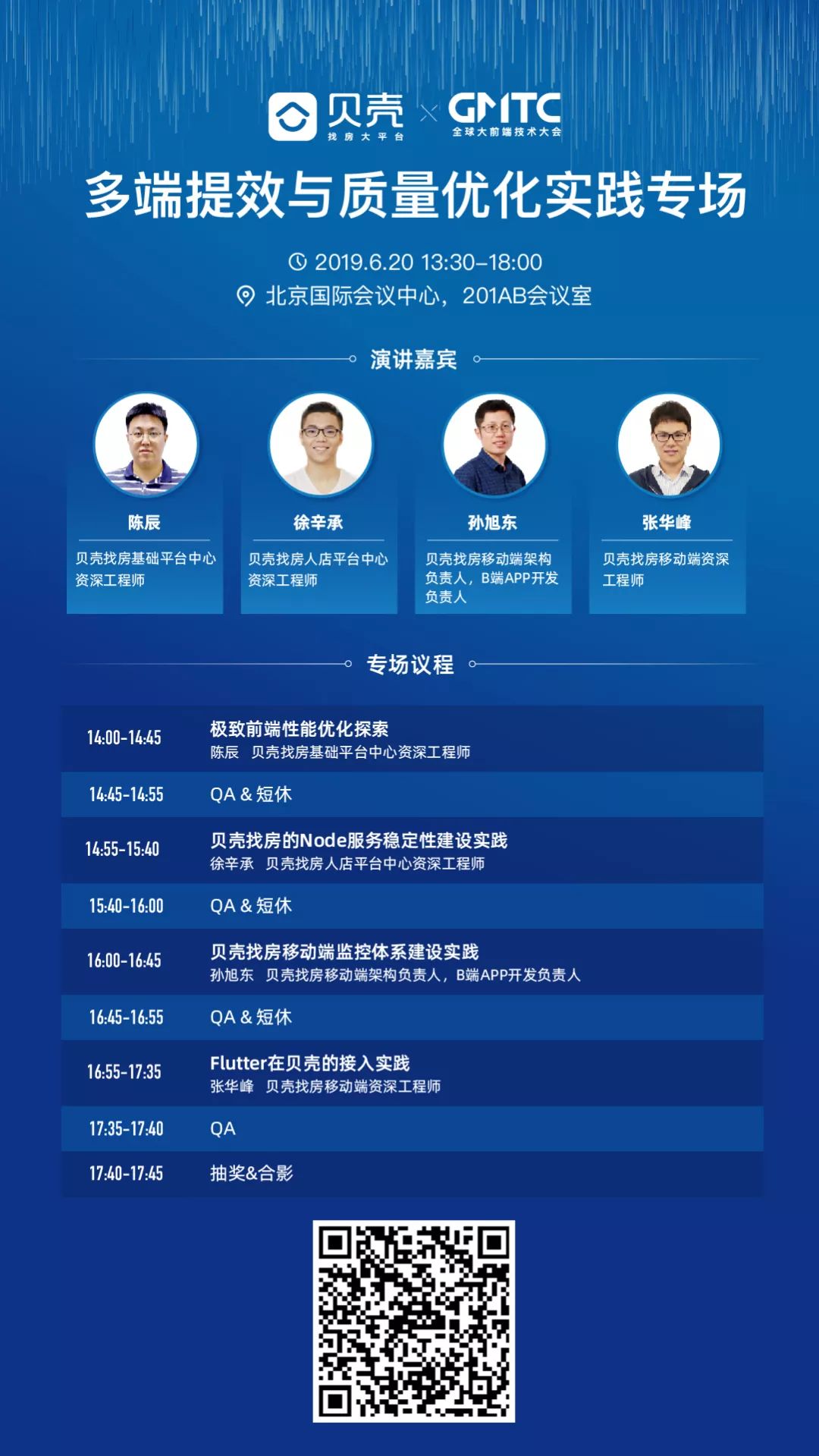 作为全球移动开发技术的瞭望站,GMTC2019 全球大前端技术大会|多端提效与质量优化专场 将带来移动开发技术的巅峰级论道。今年 6 月 20 日,战役已吹响 限额免费招募 号角……扫描图片二维码或点击阅读原文报名,将有机会免费获赠 「多端提效与质量优化技术专场听众席」 一张,贝壳定制签到礼等你来拿。