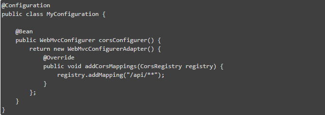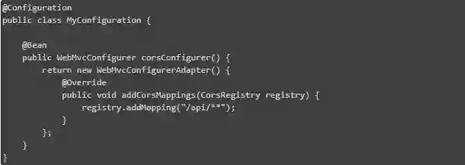 从4.2版本开始,Spring MVC对CORS提供开箱即用的支持。不用添加任何特殊配置,只需要在Spring Boot应用的controller方法上注解@CrossOrigin,并添加CORS配置。通过注册一个自定义addCorsMappings(CorsRegistry)方法的WebMvcConfigurer bean可以指定全局CORS配置: