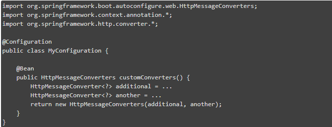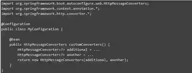 上下文中出现的所有HttpMessageConverter bean都将添加到converters列表,你可以通过这种方式覆盖默认的转换器列表(converters)。