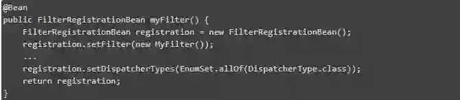 注.如果你注册一个ErrorPage,该页面需要被一个Filter处理(在一些非Spring web框架中很常见,比如Jersey,Wicket),那么该Filter需要明确注册为一个ERROR分发器(dispatcher),例如:
