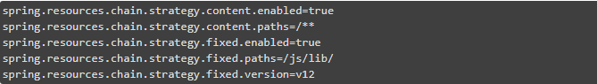 使用以上策略,JavaScript模块加载器加载"/js/lib/"下的文件时会使用一个固定的版本策略"/v12/js/lib/mymodule.js",其他资源仍旧使用内容hash的方式<link href="/css/spring-2a2d595e6ed9a0b24f027f2b63b134d6.css"/>。查看ResourceProperties获取更多支持的选项。