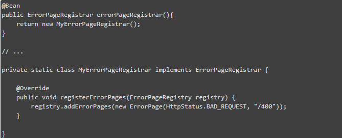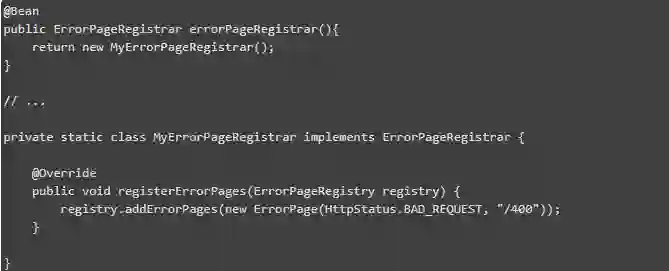 对于不使用Spring MVC的应用,你可以通过ErrorPageRegistrar接口直接注册ErrorPages。该抽象直接工作于底层内嵌servlet容器,即使你没有Spring MVC的DispatcherServlet,它们仍旧可以工作。