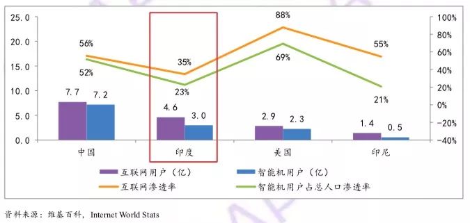 印度目前互联网用户4.6亿,互联网渗透率为35%,低于印尼55%。印度智能手机用户为3.0亿,智能机用户占总人口渗透率为23%,稍高于印尼21%。印度和印尼均从PC时代直接跨越到移动时代,由于印度人均GDP更低,电脑普及率要远低于印尼。但是印度拥有3亿的智能机用户数,而且随着中国厂商在印度的大力推广,以及印度移动电信运营商在流量、话费套餐上的大力改革(比如RelianceJio),未来印度拥有智能机的用户会越来越多。