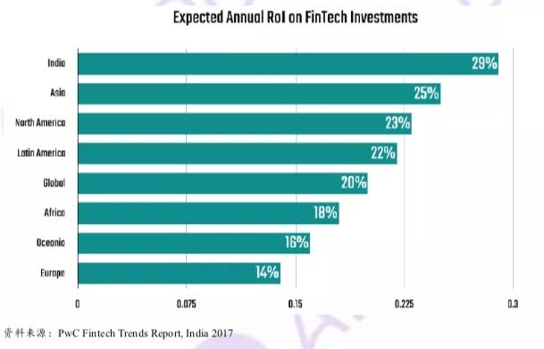 根据PwC发布的印度2017年互金行业趋势报告,印度Fintech投资年化收益达到29%,高于世界平均水平20%。