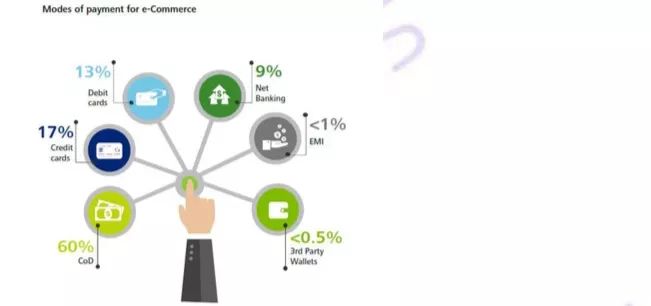 目前印度60%的电商支付方式为货到付款(CoD,cashondelivery),表明印度人民对于现金的依赖。而信用卡和借记卡的合计使用率也仅为30%,第三方数字钱包的使用率更仅为0.5%。未来随着印度数字化的推进,钱包的进一步普及,和EMI(EqualMonthlyInstallment,类似于国内分期乐)等方式进一步流行,更加会促进Fintech行业整体的发展。