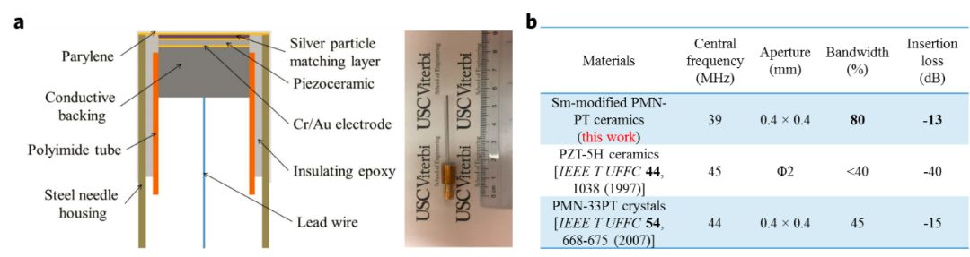 图四 a 高频超声换能器原理图及实物照片 b 超声换能器性能参数。数据源于:IEEE transactions on ultrasonics, ferroelectrics, and frequency control, 65(2), 223-230 (2018).