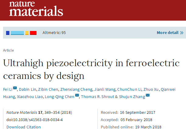 近日,Nature Materials期刊(影响因子39.7)以“设计具有高压电效应的铁电陶瓷材料”为题发表了西安交大电信学院电子科学与技术系教师李飞副教授及其合作者的一篇研究论文,报道了他们在高性能压电陶瓷的设计合成方面取得的重大突破。