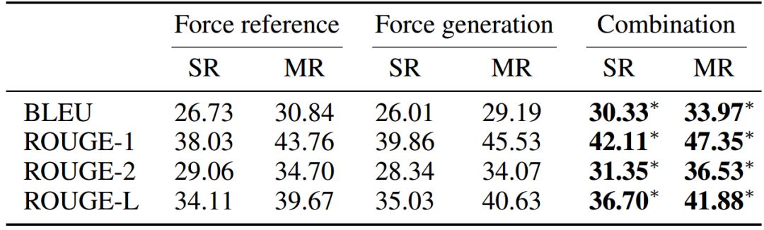 此外,论文还进行了分析实验。首先,论文对比了 RefNet 在只进行生成(Force generation)或者只进行抽取(Force reference)的设置下的实验结果,见图 12。实验结果说明两种模式是互补的,二者结合起来可以进一步提升结果。