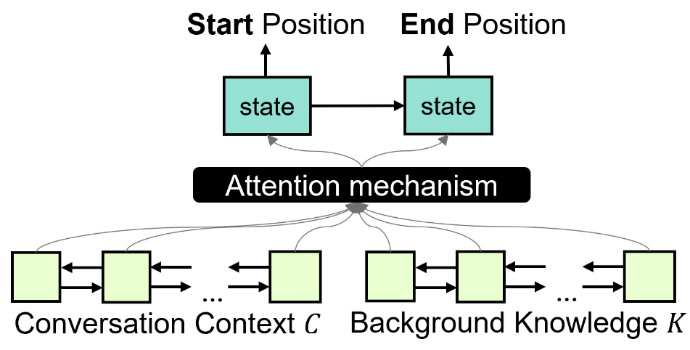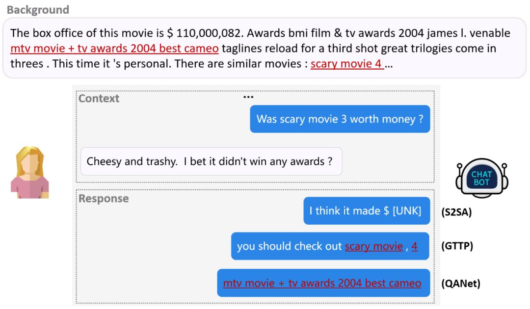 如图 5 所示,抽取式方法直接从背景知识里抽取一个语义单元(span)作为回复。图 3 给出 QANet 在此场景下的回复。可以发现此类方法的优点是定位背景知识准确;缺点是回复生硬,缺乏流利性。