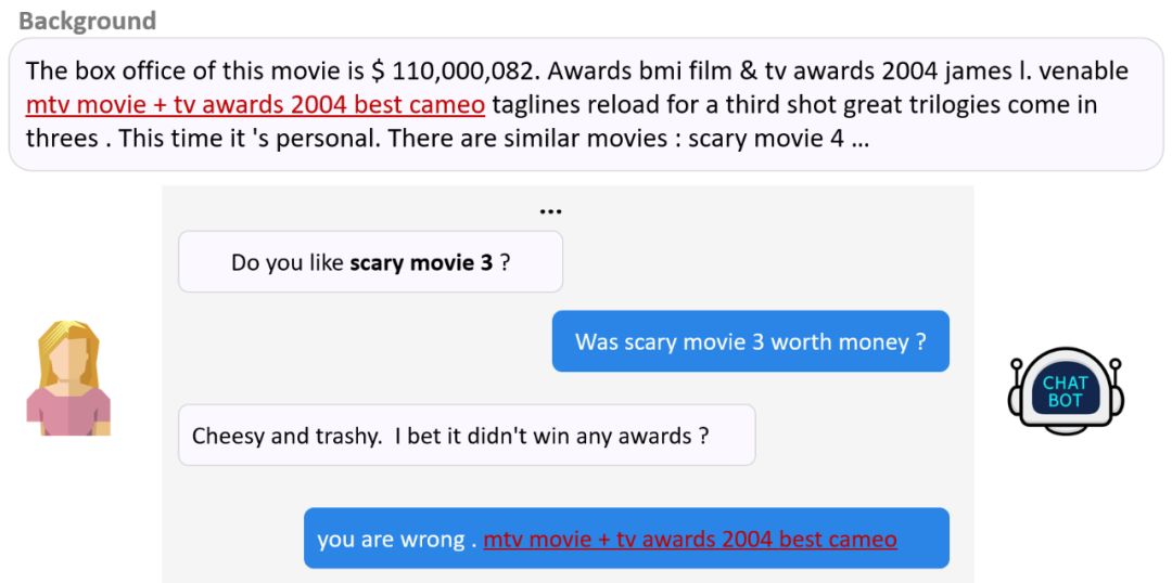 近些年来,有些研究通过改进目标函数或者引入话题信息来尝试解决这一问题,也有研究通过引入背景知识来解决这一问题,我们称之为基于背景知识的对话。如图 2 所示,其任务目标为同时基于外界背景知识与对话上下文,生成自然、高信息量的回复。