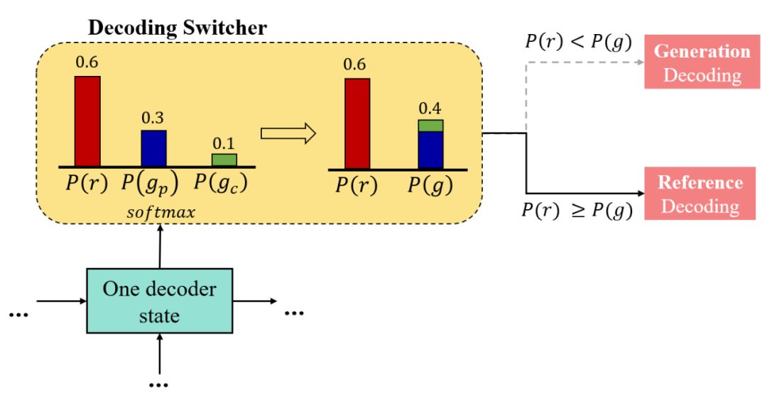 如果 P(r)<P(g),我们执行生成解码生成一个词。