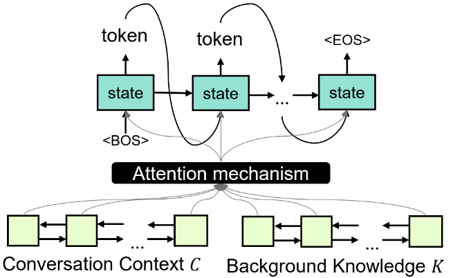 其中,知识编码器、语境编码器分别通过双向循环神经网络把背景知识与对话上下文编码成隐状态表示。之后,二者的隐状态表示会作为混合解码器的输入。