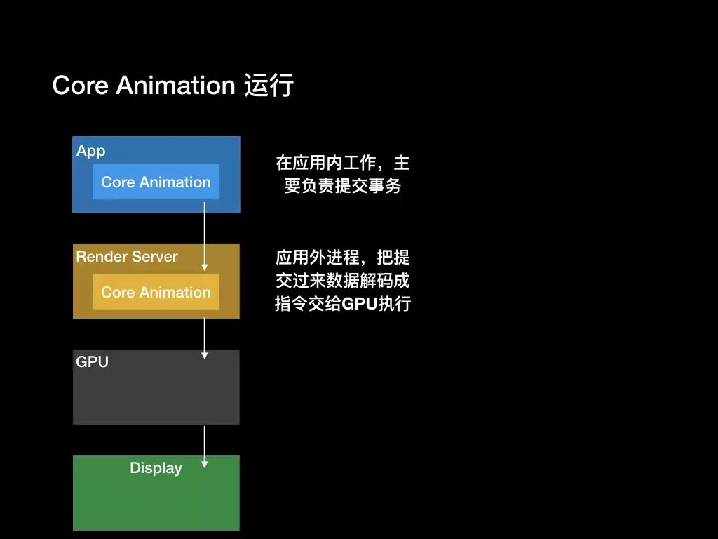 如上图所示,Core Animation在App将图层数据提交到应用外进程Render Server,这是Core Animation的服务端,把数据解码成GPU可执行的指令交给GPU执行。可以看出一个问题渲染服务并不是在App进程内进行的,也就是说渲染部分我们无法进行优化,我们可以优化的点只能在第一个提交事务的阶段。那么这个阶段Core Animation到底做了什么呢?下面我们一起来看看!