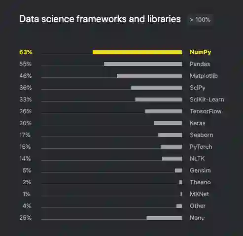 在数据科学框架和库方面,NumPy 依然稳坐龙头老大位置,甚至于比例还在上升,今年已经实现了 63% 的占比,其次是 Pandas,PyTorch 则居于第 9。