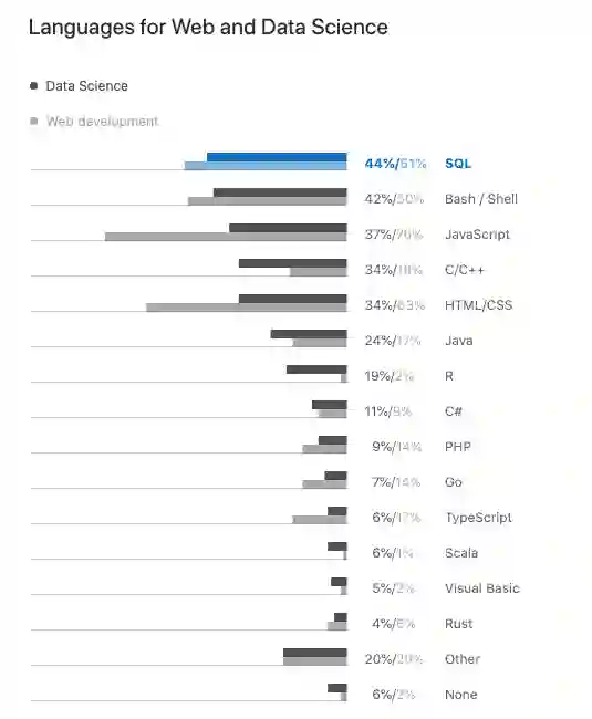 不过,两者还是有差异点,在 Web 开发中,JavaScript、TypeScript、HTML/CSS 和 PHP 等的使用率非常高,而对于数据科学工程师们来说,C/C++、Java 和 R 才更受欢迎。