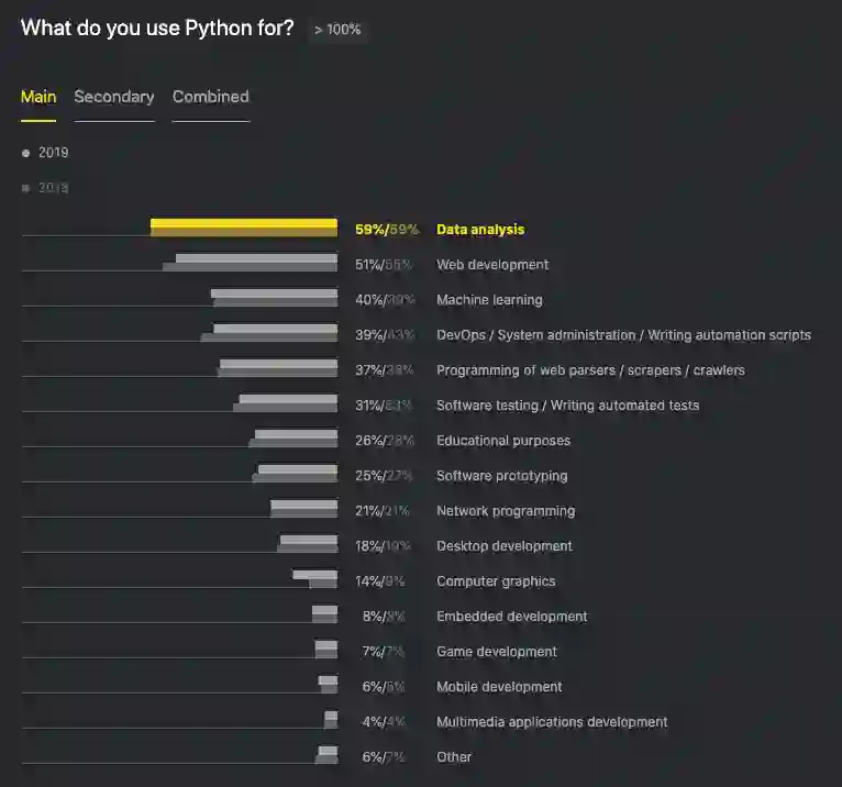 开发者们用 Python 都在做什么?从官方统计数据来看,数据科学和 Web 开发依然遥遥领先,机器学习位居第三。