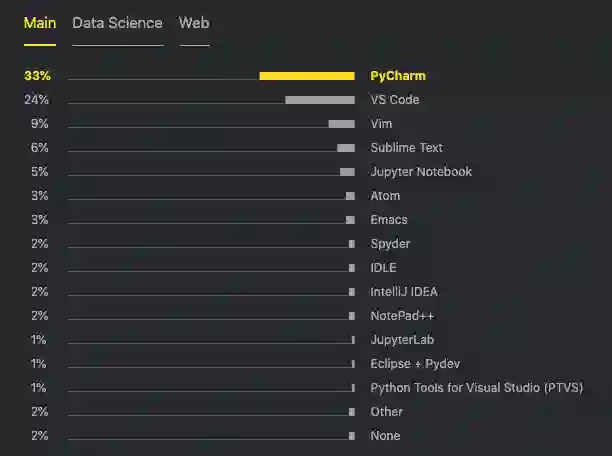 而在编辑器及 IDE 方面,尽管 VS Code 在所有开发者中深受欢迎,不过在 Python 的世界里,它还是要让位给 PyCharm,其以 33% 的占比位列第一。但 PyCharm 还是有着非常强的危机感,毕竟 VS Code 的增长速度极快,它已经从 2017 年的 7%,快速上升到了 24%。