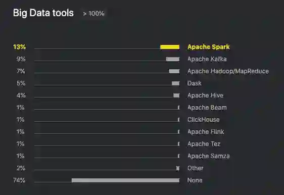 在大数据方面,Apache Spark 以 13% 的占比位列第一。