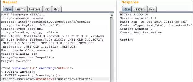 观察上面的请求与响应,我们可以看到,应用程序正在解析XML内容,接受特定的输入,然后将其呈现给用户。为了测试验证XML解析器确实正在解析和执行我们自定义的XML内容,我们发送如下的请求