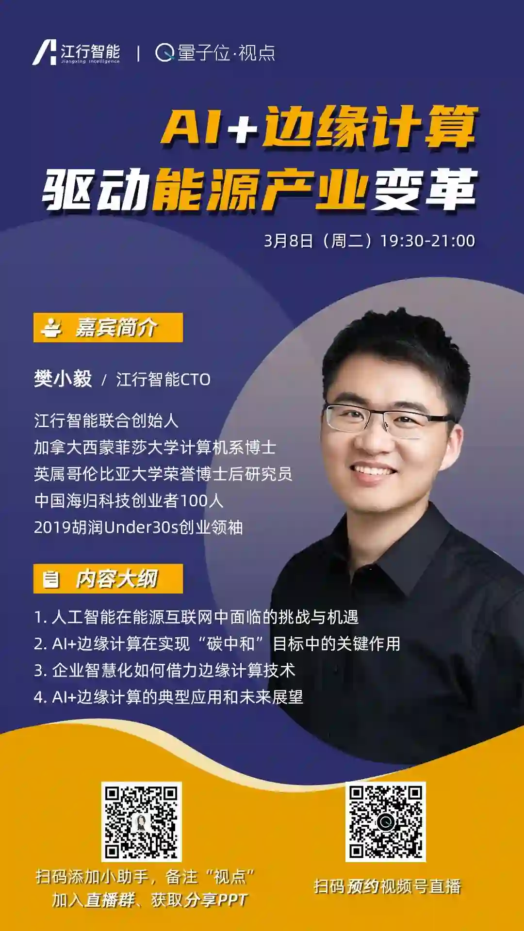 3月8日19:30,「量子位·视点」CEO/CTO系列分享活动邀请了江行智能CTO樊小毅博士,将围绕AI+边缘计算如何助力碳中和目标、典型应用和未来展望等内容,直播分享个人见解。扫码可报名: