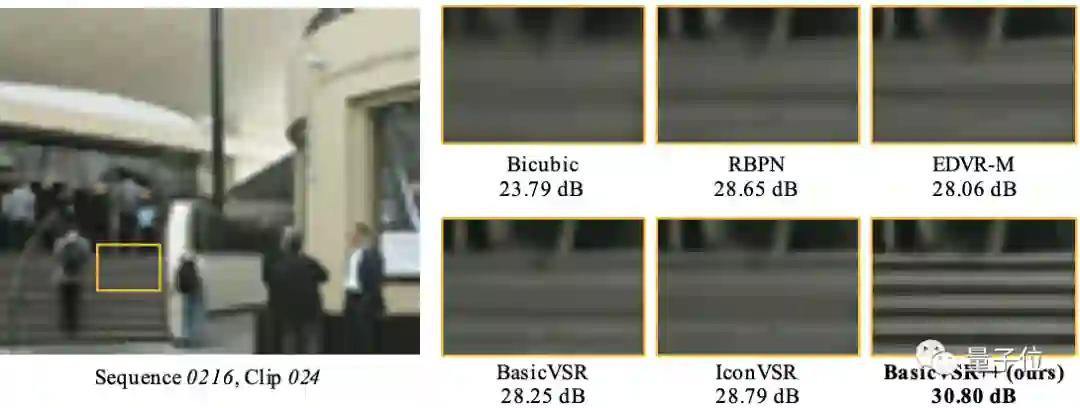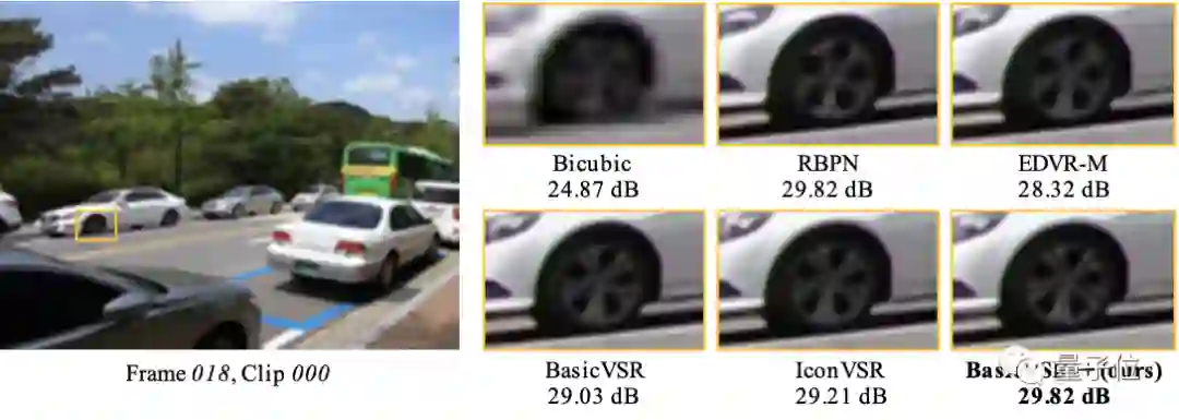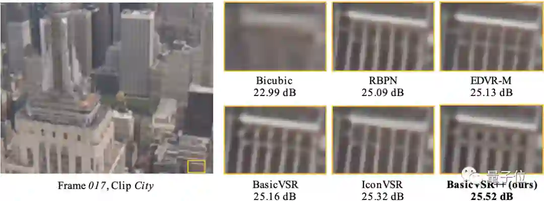 现在,这个BasicVSR+++在基本相同的参数量下,不仅性能大幅超过前辈,PSNR(峰值信噪比,图像质量评估指标)提高了0.82dB,还能应用到更多的视频复原任务中(例如压缩视频增强)。