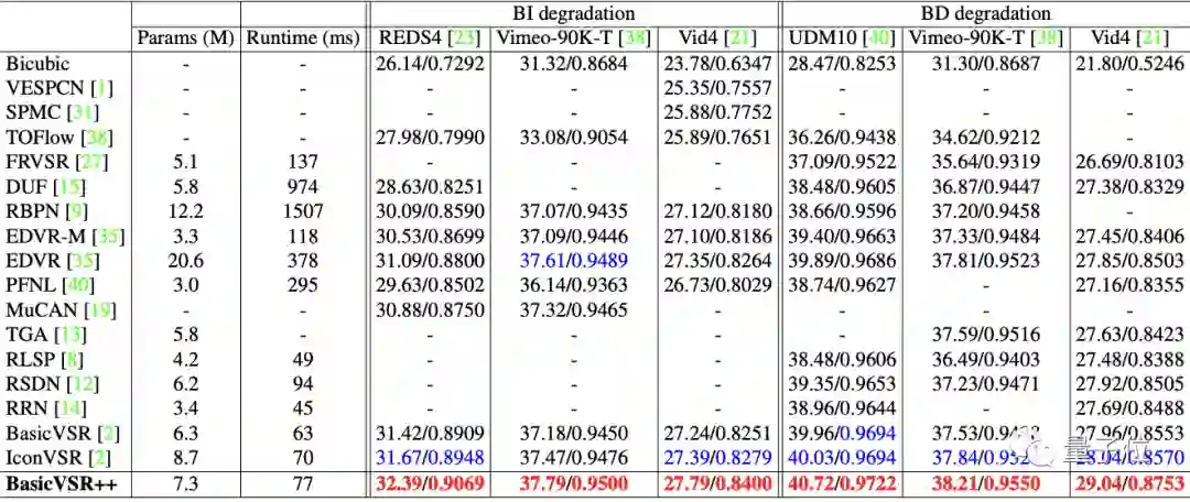 作者对比了16种不同视频超分算法的性能、参数量以及耗时,结果是BasicVSR++在所有数据集下的两种退化方式中均取得最佳性能(红色代表最佳分数,蓝色代表次佳分数)。