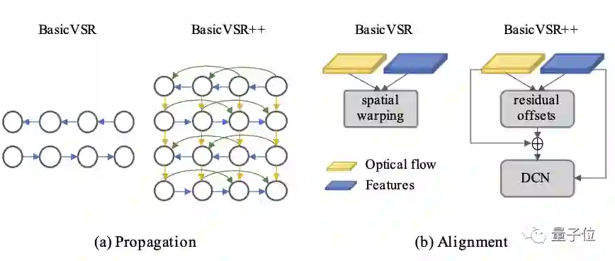 因此,加强版的BasicVSR++在传播和对齐方面进行了重新改造,采用了二阶网格传播(second-order grid propagation) 和光流引导可变形对齐 (flow-guided deformable alignment)的设计来改善网络中的信息聚合能力,提升遮挡区域的鲁棒性和有效性。