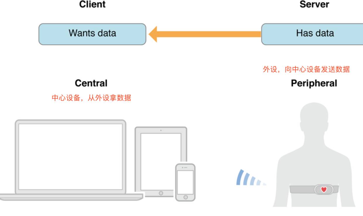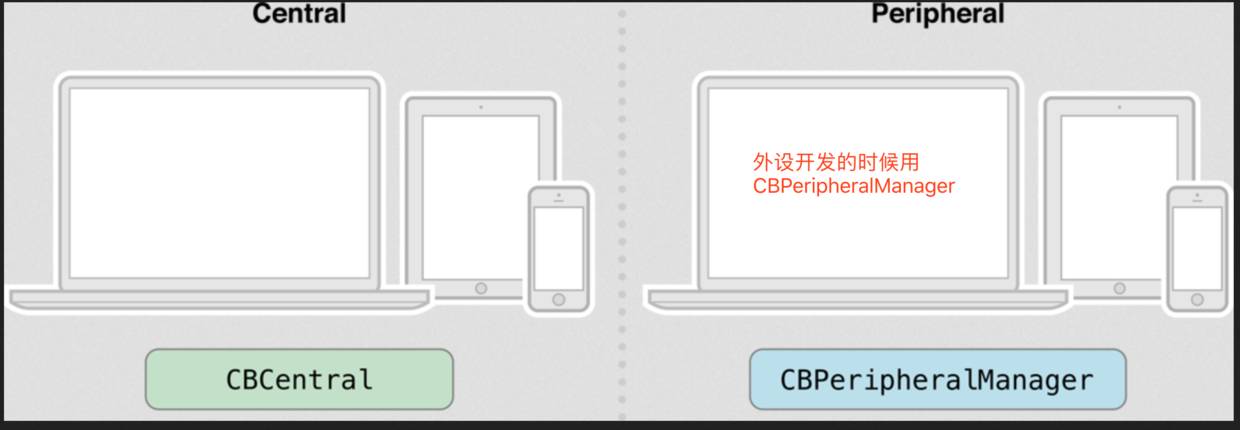 CoreBluetooth可以分为两大模块,中心设备central,外设peripheral,它们俩各有自己的一套API供我们使用。