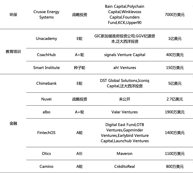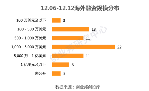 本周海外融资事件的融资规模主要集中在1,000-5,000万美元,共22起。融资额达1亿美元以上的案例有6起。