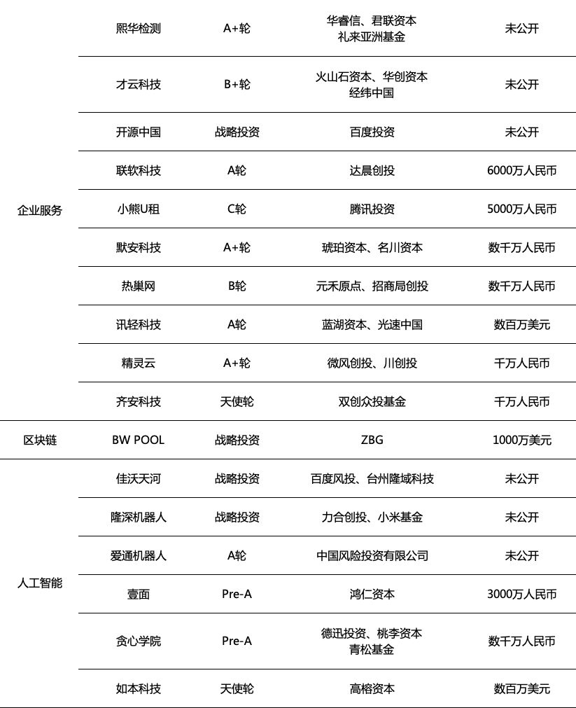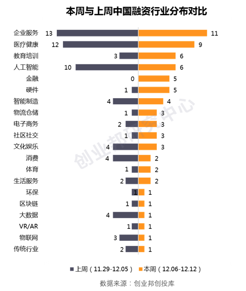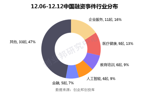 企业服务、医疗健康持续受到资本热捧;金融、硬件行业本周有所回暖,人工智能融资事件略有减少。