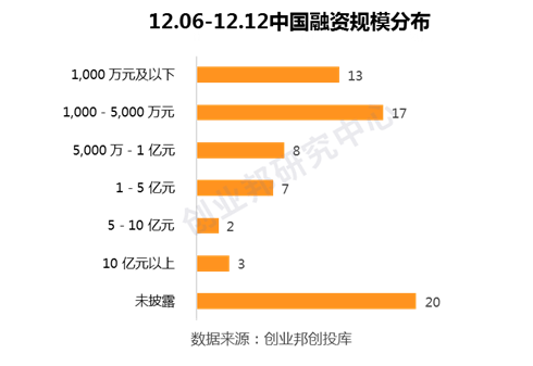本周融资事件的融资规模主要集中在1,000-5,000万元,共17起。