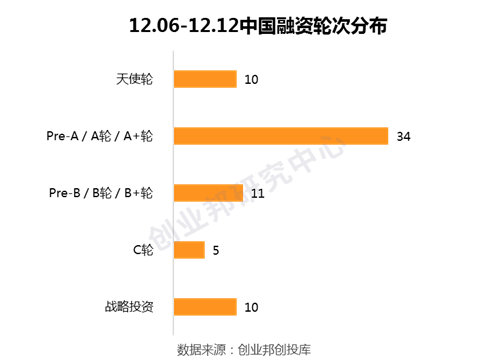 本周融资事件的融资轮次主要集中在早期(种子轮、天使轮、A轮),共44起,其中A轮事件最多,34起;中后期(B轮、C轮、D轮及以后)有16起;战略投资本周有10起。