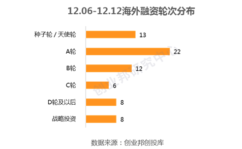 本周海外融资事件的融资轮次主要集中在早期(种子轮、天使轮、A轮),共35起,其中A轮事件最多,22起;战略投资有8起。