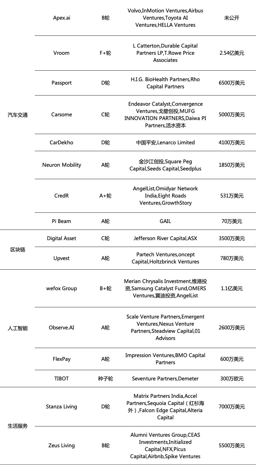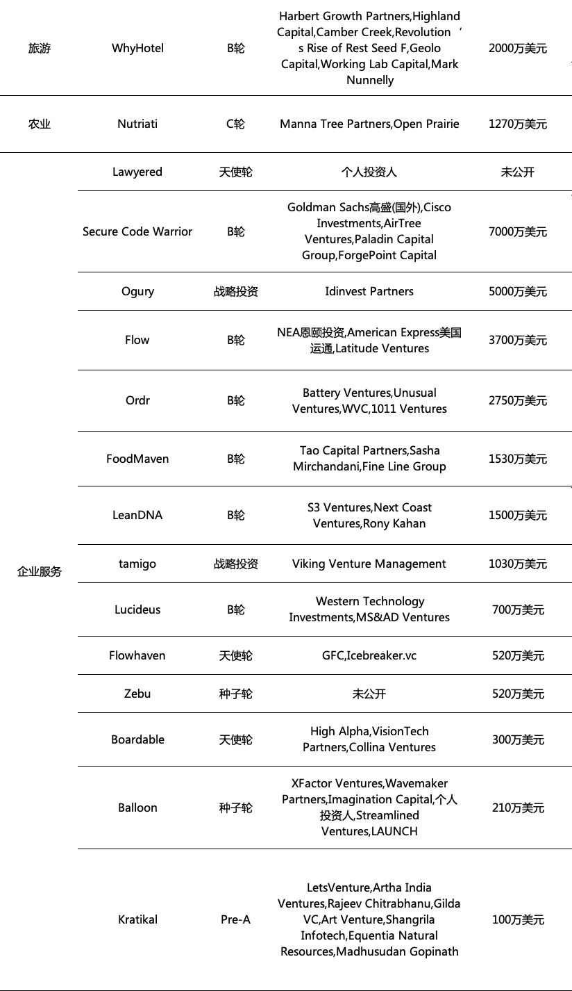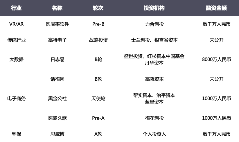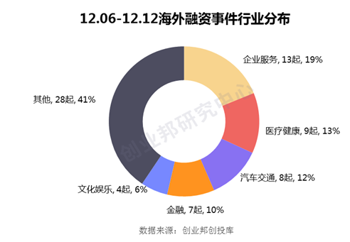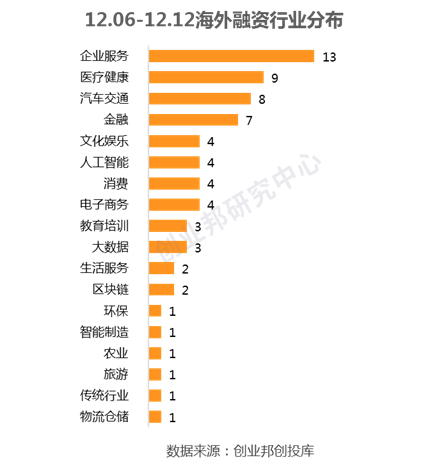 其中融资案例数最多的五大行业分别是企业服务13起,医疗健康9起,汽车交通8起,金融7起,文化娱乐、人工智能消费、电子商务并列4起。