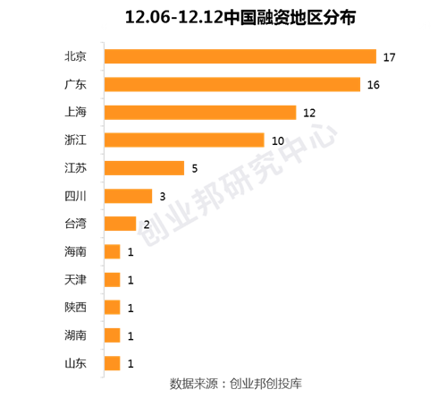 北上广融资事件共45起,占比64.29%;另外,浙江也较受关注。