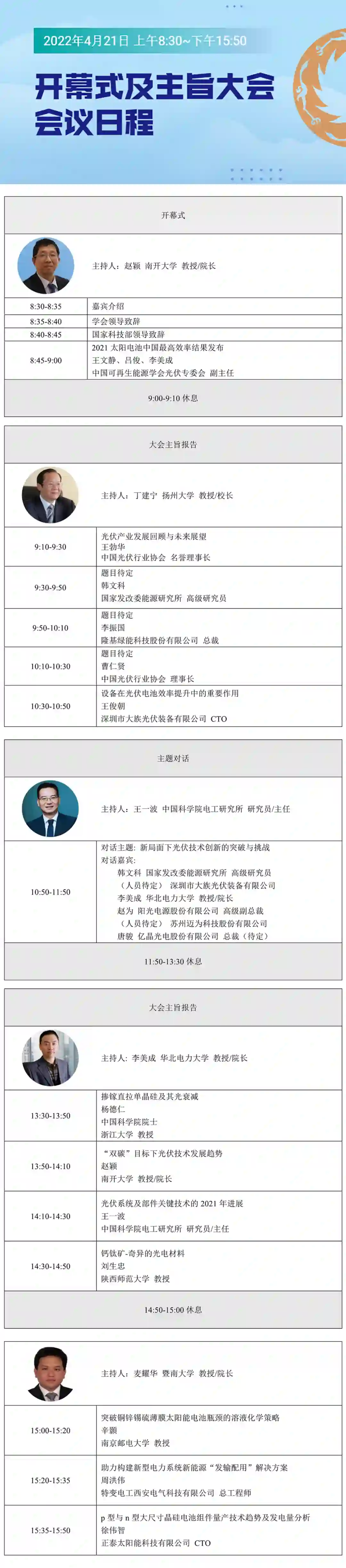 第十九届中国光伏学术大会(CPVC19)将于2022年4月20日-4月22日以全线上的形式召开。在此,我们诚挚地邀请太阳能光伏及相关领域内的专家、学者、教师、学生及工程技术人员踊跃参会。