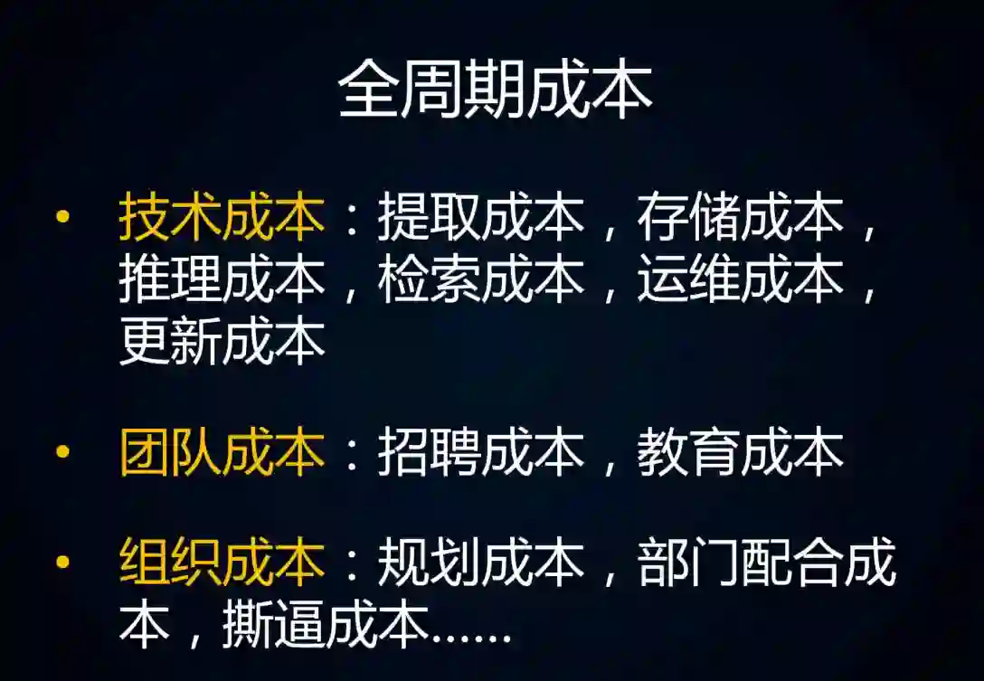 刚才提到成本,有哪些成本?我认为分为技术成本、团队成本和组织成本。我把技术成本放在第一个,并不意味着它是最重要的,只是大家更容易理解这件事情。技术有知识提取的成本、知识存储的成本、知识推理的成本、知识检索的成本、运维的成本、更新的成本,这些都具体不多说了,大家应该很容易理解。