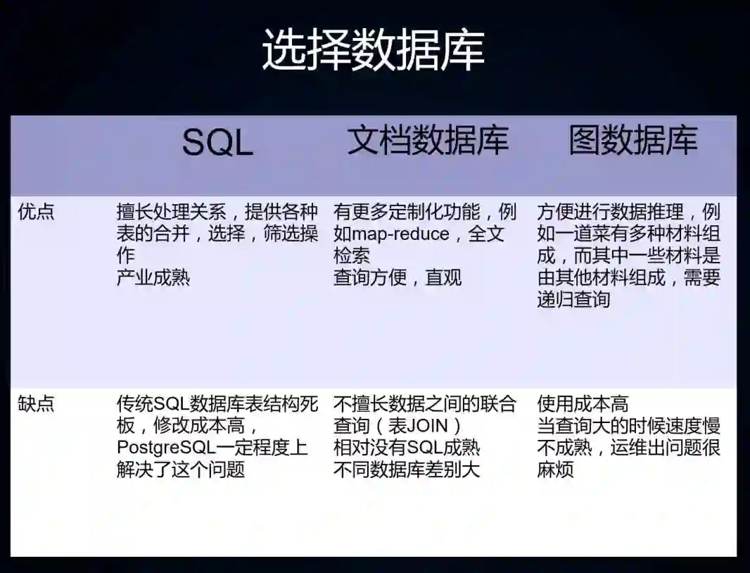 优先选择什么样的数据库?我把它称为关系文档数据库。第一个,它要自身要支持 SQL 查询,第二个它要支持 JSON。为什么要支持这两个?还可以有其他的选择吗?为什么不是 XML 的数据库?现在 JSON 就是整个互联网上数据的标配,如果你选择其他的数据库还要再做一层的转化,这就是提高了成本,不要小看这个转换,会带来无尽无穷的数据更新的困难。