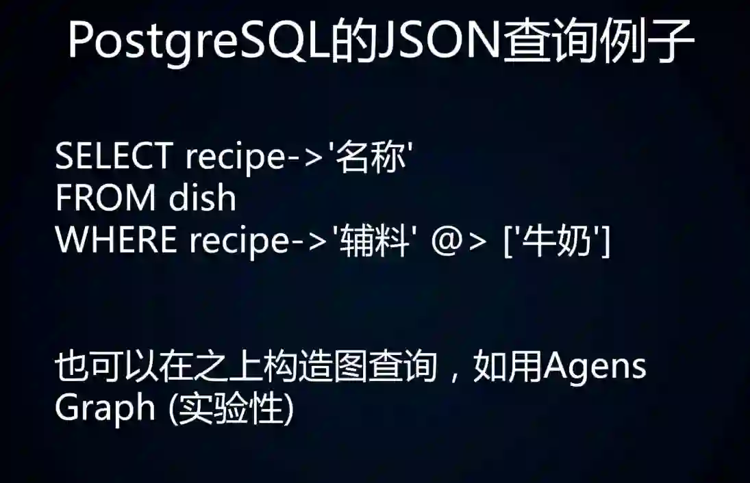 这是一个 PostgreSQL 上 JSON 查询的例子,我选了一个特别特别简单的例子。还有好几种不同的原语,可以构造出非常复杂的JSON 的查询。