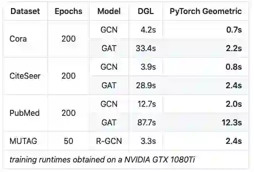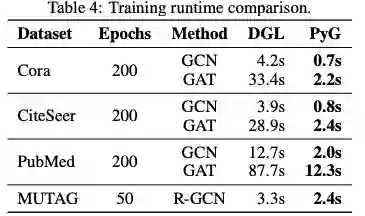 我们对多个数据模型对进行了多次实验,并报告了在单个 NVIDIA GTX 1080 Ti 上获得的整个训练过程的运行情况 (表 4)。与 Deep Graph Library (DGL)(Wang et al., 2018a) 相比,PyG 训练模型的速度快了 15 倍。