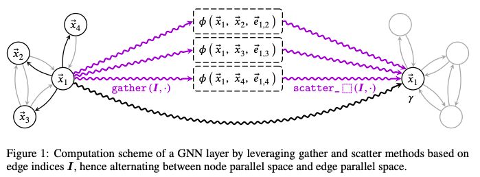 在实践中,这可以通过收集和散布节点特性并利用 broadcasting 进行和