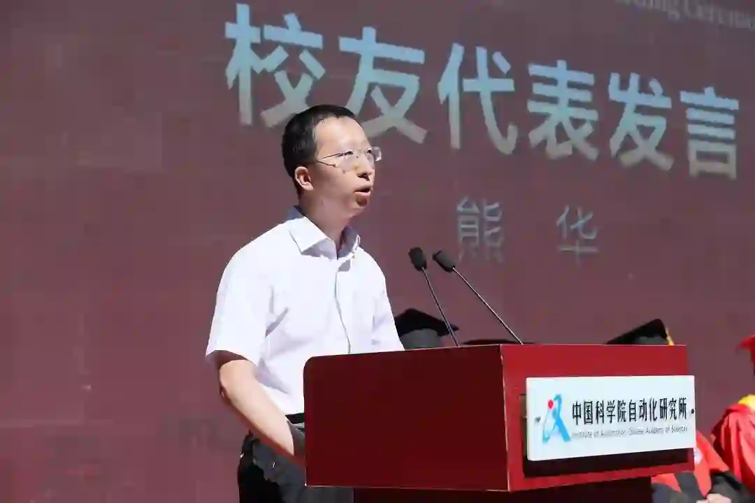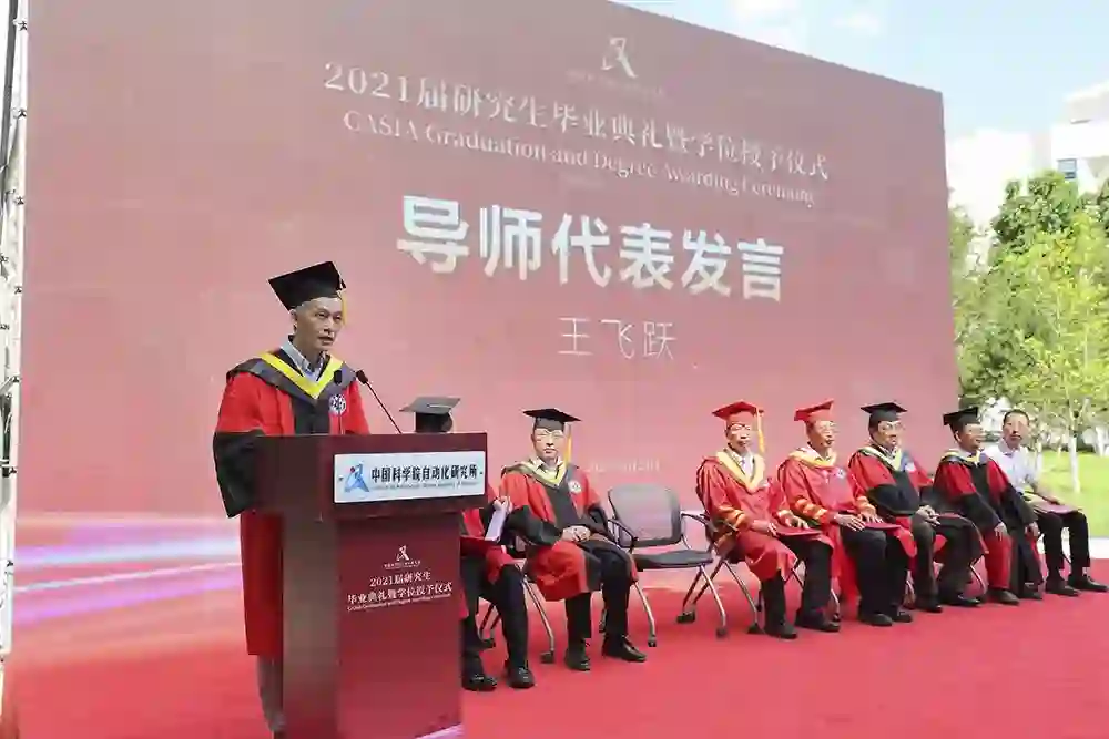 导师代表王飞跃研究员饱含深情地寄语毕业生“坚持、智能、简单,做时代的光明使者”。他强调“坚持才有希望,不是有了希望才坚持”,“我坚信,你们有更多更好的方式把复杂变智能变简单,更加有效,不是内卷,是让大家不要太累,让百姓过上更好的日子,让国家和民族更加富强”。最后他叮嘱毕业生要做好时间规划,少熬夜,争做“睡好觉、吃好饭、健好身”的三好学生。