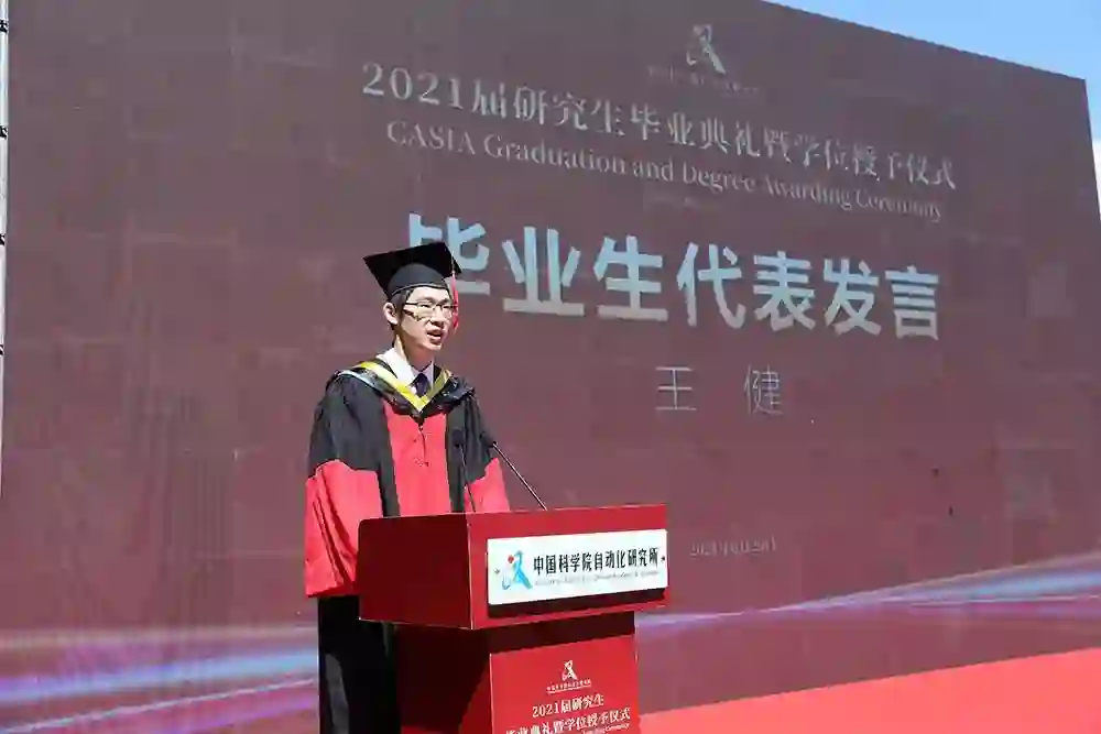 毕业生代表、复杂系统管理与控制国家重点实验室2016级博士生王健代表毕业生感谢自动化所为同学们提供的良好科研创新环境,他回顾了自己在研究所的学习、生活经历,表达了对研究所和导师的感恩之情,毕业后他选择留所继续从事科研工作。他最后总结道,作为自动化所的毕业生,要带着自强不息、实事求是的精神和态度,用自己的学识为国家、为党和人民贡献力量!
