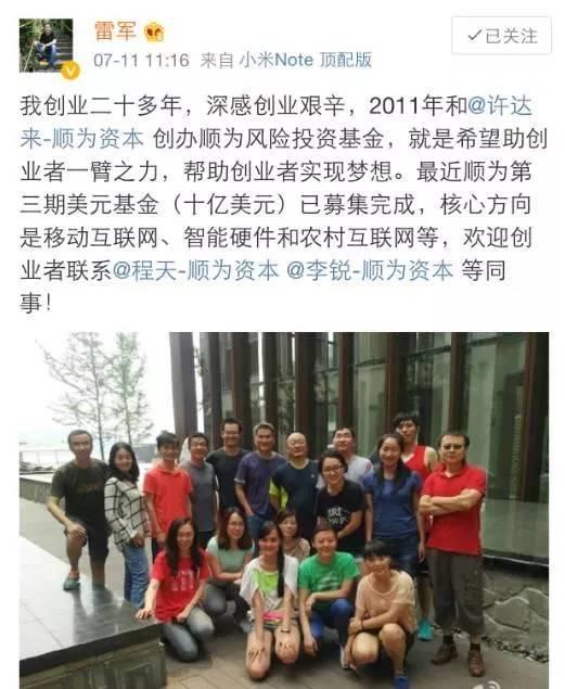 雷军是顺为资本的发起人和董事长,目前管理 17.5 亿美元的美元基金和 20 亿元的人民币基金,起名顺为,也有顺势而为的意思。