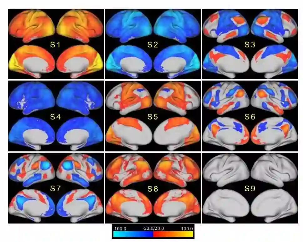 胡小平教授提出,通过重复实验比较稳定性,可以确定状态的个数。通过检验发现,9个状态是稳定的可重复性结果,若设置状态总量在10以上则稳定性会迅速下降。因此,静息态活动可以分解成为9个状态,只有这9个状态具有时间上的稳定性和一致性。与此同时,这一结果也具有相当的效度。以100名被试的数据得出的结果,与将其分为两组各50名被试所得的结果是一致的。通过这种方法,研究者能够识别大脑状态及其时间特征,包括各状态之间的变化与切换等。