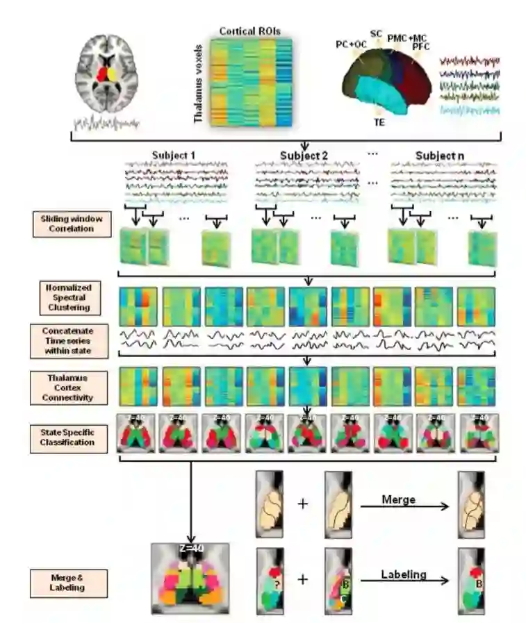 为推导丘脑-皮质连接,从十个与丘脑有关的ROI出发:双侧的前额皮质(PFC)、前运动皮质(PMC)和运动皮质(MC)、躯体感觉皮质(SC)、顶叶皮质(PC)和枕叶皮质(OC)、颞皮质(TE)。用基于滑动时间窗口的方法来检查动态功能连接,使其包含了时间动态信息,而后进行时间聚类。结果显示存在9个丘脑-皮质的连接状态,且动态分析的分割结果比静态分析的组间变异性更小,并与已知的解剖结构具有更高的一致性。因此,rsfMRI提供了研究脑中精细结构的新途径。