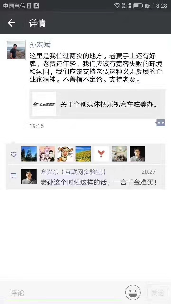 而随后,在不到两个小时内,孙宏斌针对自媒体爆出贾跃亭在美国拥有豪宅的消息,发朋友圈表示对贾跃亭的支持。朋友圈内容如下:
