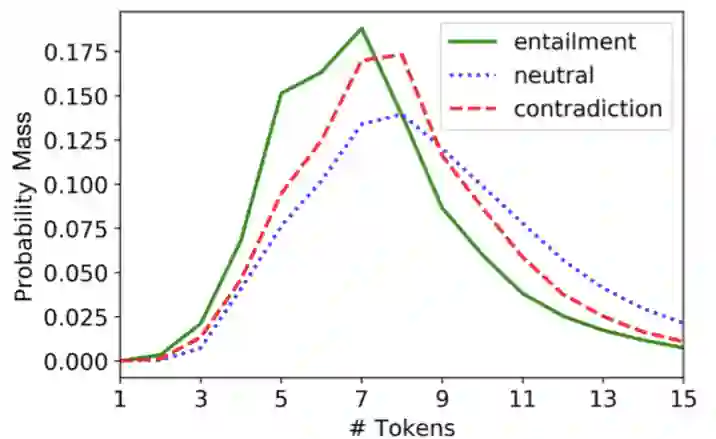 我们发现,生成句子中tokens的数量在不同的推理类别中并不是平均分配的。下图显示,中性的句子中token往往较长,而相关句子往往较短。句子长度的差异可能表明,众包工作者在生成相关句子时只是简单地从前提句子p中删除了几个单词。而事实上,当每个句子都用bag of words表示时,SNLI中有8.8%的相关生成句子完全包含在前提句子之中,而只有0.2%的中性和矛盾句子包含前提。