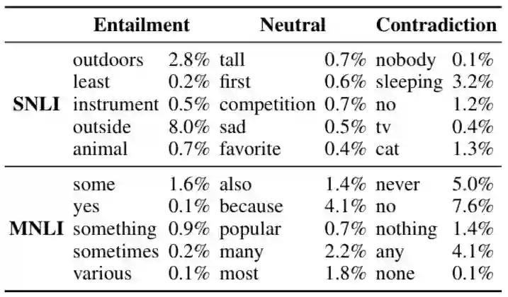 之前我们说到,超过一半的MultiNLI数据和三分之二的SNLI数据都有明显的人工痕迹,为了从中总结出它们的特点,我们将对数据进行大致分析,重点关注词汇的选择和句子的长度。