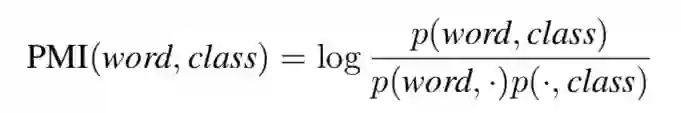 为了了解特定词汇的选择是否会影响句子的分类,我们计算了训练集中每个单词和类别之间的点互信息(PMI):